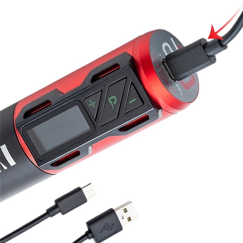 - Pantalla LED visible: Muestra voltaje, batería y cronómetro de trabajo en tiempo real.